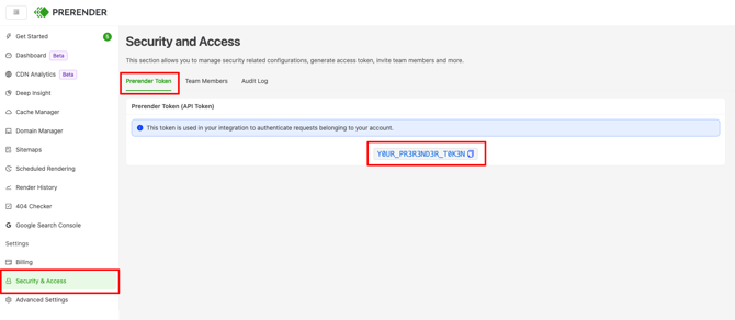 - Add your Prerender.io Token from the Security and Access menu as the value.