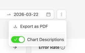 Each chart on the main Dashboard includes an optional description that can be toggled on or off via the three-dot menu. This is designed to help non-technical users better understand what each chart represents. The feature is available to all users regardless the plan.