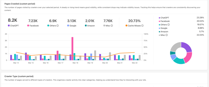 Key statistics - such as Pages Crawled, Cache Hit Ratio, Error Rate and Average Crawl Time - are displayed at the top for a quick overview of your site’s performance. Check KPI changes compared to the previous period.