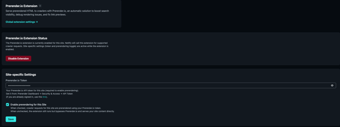 Function: toggles Prerender.io’s service for the site while the extension remains installed. This is the per-site runtime toggle that activates or deactivates Prerender behavior. Be explicit about both controls in the UI copy so admins don’t confuse disabling the extension with turning off rendering.