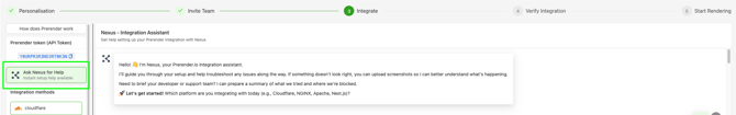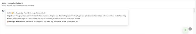 Nexus will walk you through your integration from start to finish or help you with specific parts as needed. In case you are stuck , Nexus can generate a clear summary of what was attempted, what worked, and where you got stuck. You can use this summary to share all relevant context with Prerender Support or your engineering team.